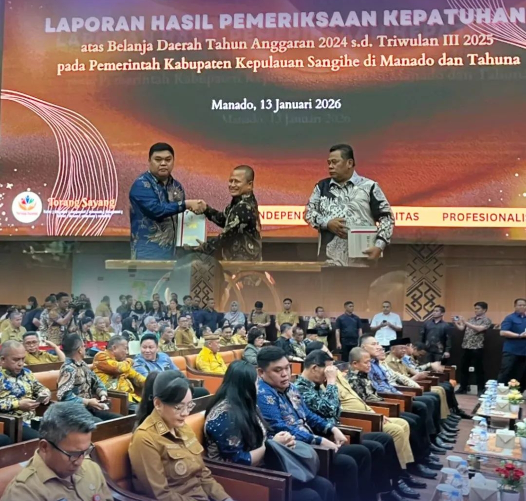 BERITA ONLINE LOKAL, SANGIHE — Wakil Bupati Kepulauan Sangihe, Tendris Bulahari, menghadiri acara penyerahan Laporan Hasil Pemeriksaan (LHP) Kepatuhan atas Belanja Daerah Tahun Anggaran 2024 hingga Triwulan III Tahun 2025. Kegiatan ini berlangsung di Kantor BPK RI Perwakilan Provinsi Sulawesi Utara, Manado, Selasa (13/1/2026).