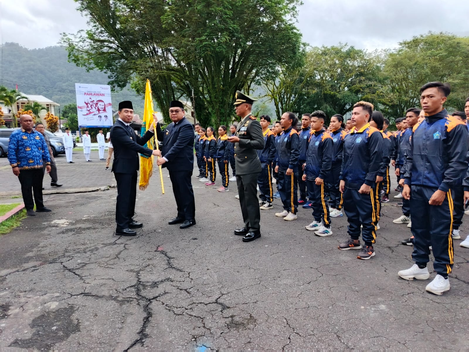 BERITA ONLINE LOKAL, SANGIHE — Dalam momentum penuh makna bertepatan dengan Hari Pahlawan, Senin (10/11/2025), Bupati Kepulauan Sangihe, Michael Thungari, secara resmi melepas kontingen Kabupaten Kepulauan Sangihe untuk mengikuti Pekan Olahraga Provinsi (Porprov) Sulawesi Utara ke-XII. Upacara pelepasan ini ditandai dengan penyerahan bendera daerah oleh Bupati kepada Wabup Tendris Bulahari yang juga selaku Ketua umum KONI dan juga didampingi oleh Dandim 1301/Sangihe sebagai Ketua Kontingen Sangihe.