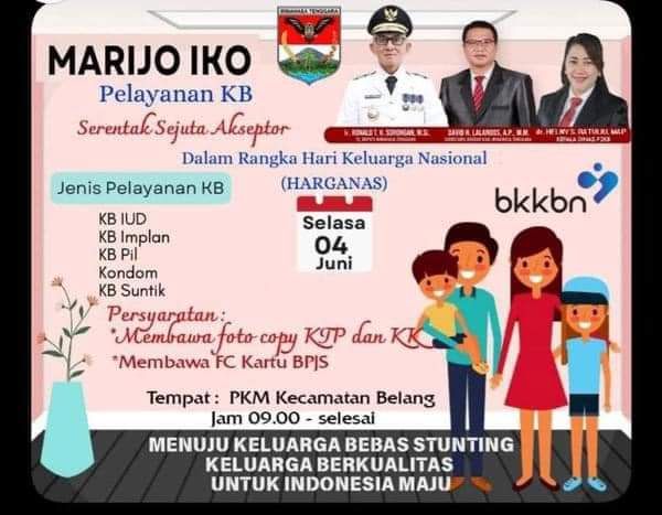 Selain pelayanan KB, kegiatan Pelayanan KB Serentak Sejuta Akseptor juga melibatkan Kabid KB serta pihak Puskesmas untuk mendukung penyediaan layanan KB berkualitas kepada para akseptor KB. Dalam kegiatan ini, Puskesmas Belang menjadi tempat sentral pelayanan KB dan dilengkapi dengan tenaga kesehatan yang dibekali dengan informasi dan teknologi terbaru dalam pelayanan KB. Hal ini akan mempermudah para akseptor KB untuk mendapat pelayanan KB berkualitas dan terjangkau secara mudah dan cepat.