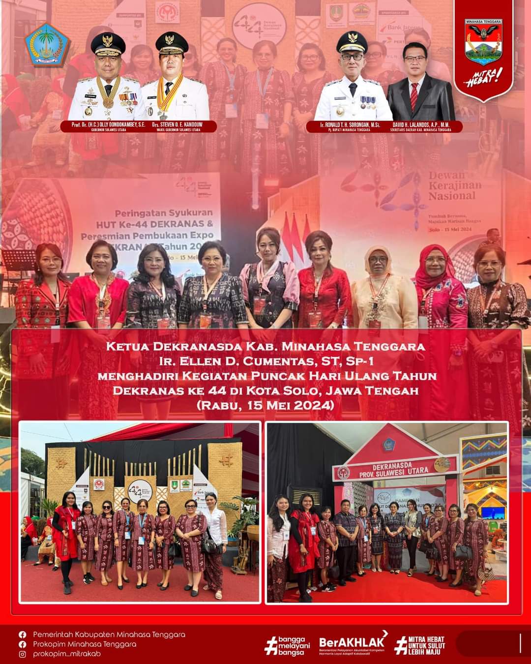 Ratahan,Beritaonlinelokal.com – Ketua Dewan Kerajinan Nasional Daerah (Dekranasda) Kabupaten Minahasa Tenggara Ir Ellen Cumentas,ST, Sp-1 beserta jajaran pengurus berkesempatan menghadiri puncak peringatan Hari Ulang Tahun Dewan Kerajinan Nasional (Dekranas) ke-44 di Kota Solo, Provinsi Jawa Tengah, Rabu (15/5/2024) kemarin.