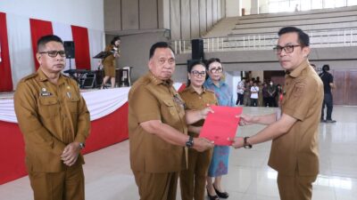Setelahnya, dirangkaikan dengan penyerahan SK Plt Kepala Dinas Perpustakaan dari Bupati kepada Staf Ahli Bupati Bidang Pemerintahan Hukum dan Politik, Johnny Tendean, AP, MAP.