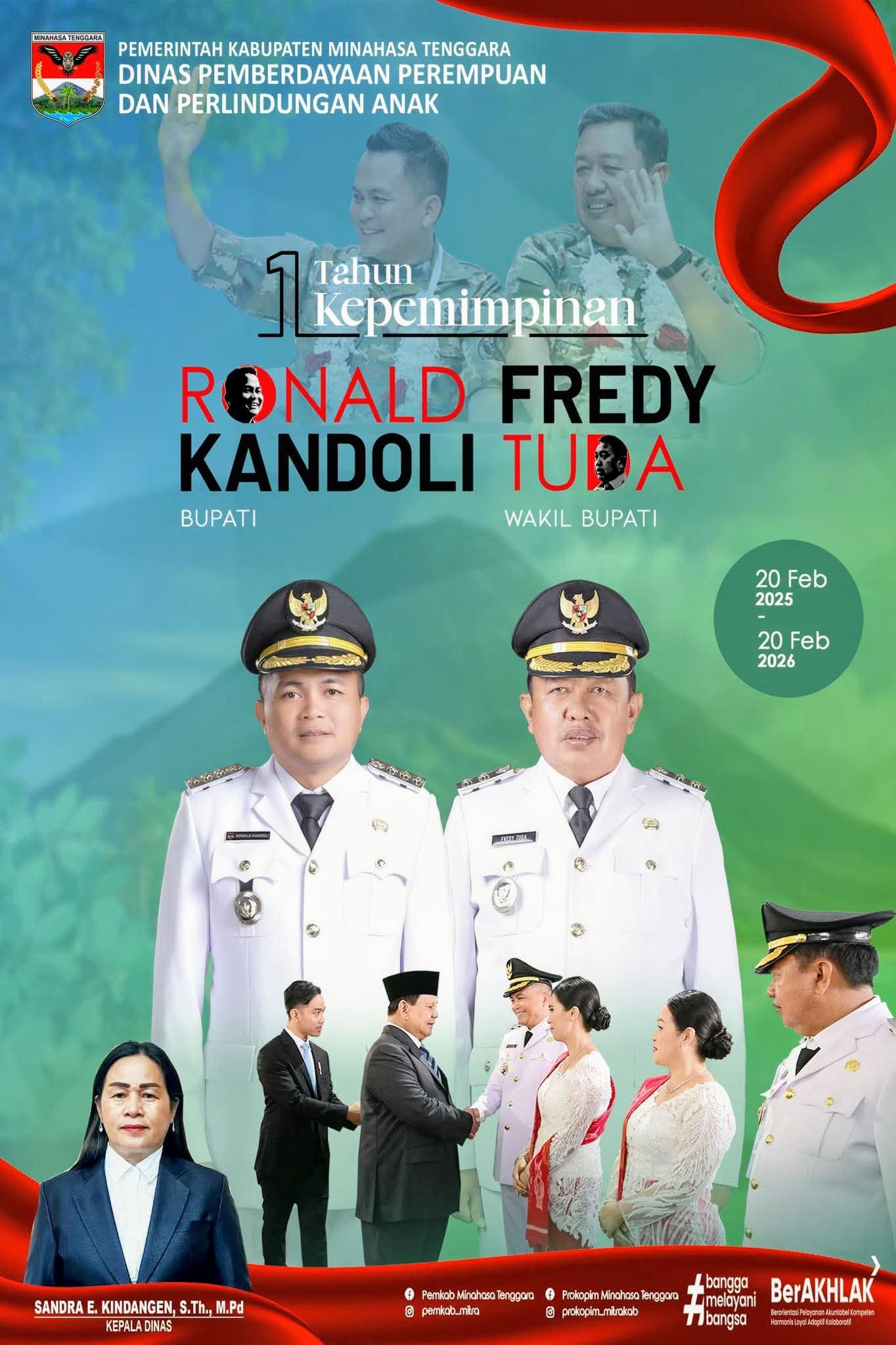 Ratahan,BeritaOnlineLokal.com – Kepala Dinas Pemberdayaan Perempuan dan Perlindungan Anak (DP3A), Sandra Kindangen, S.Th, M.Pd bersama seluruh jajaran, mengucapkan Selamat memperingati Satu Tahun Kepemimpinan Bupati Ronald Kandoli Dan Wakil Bupati Fredy Tuda 20 Februari 2026.