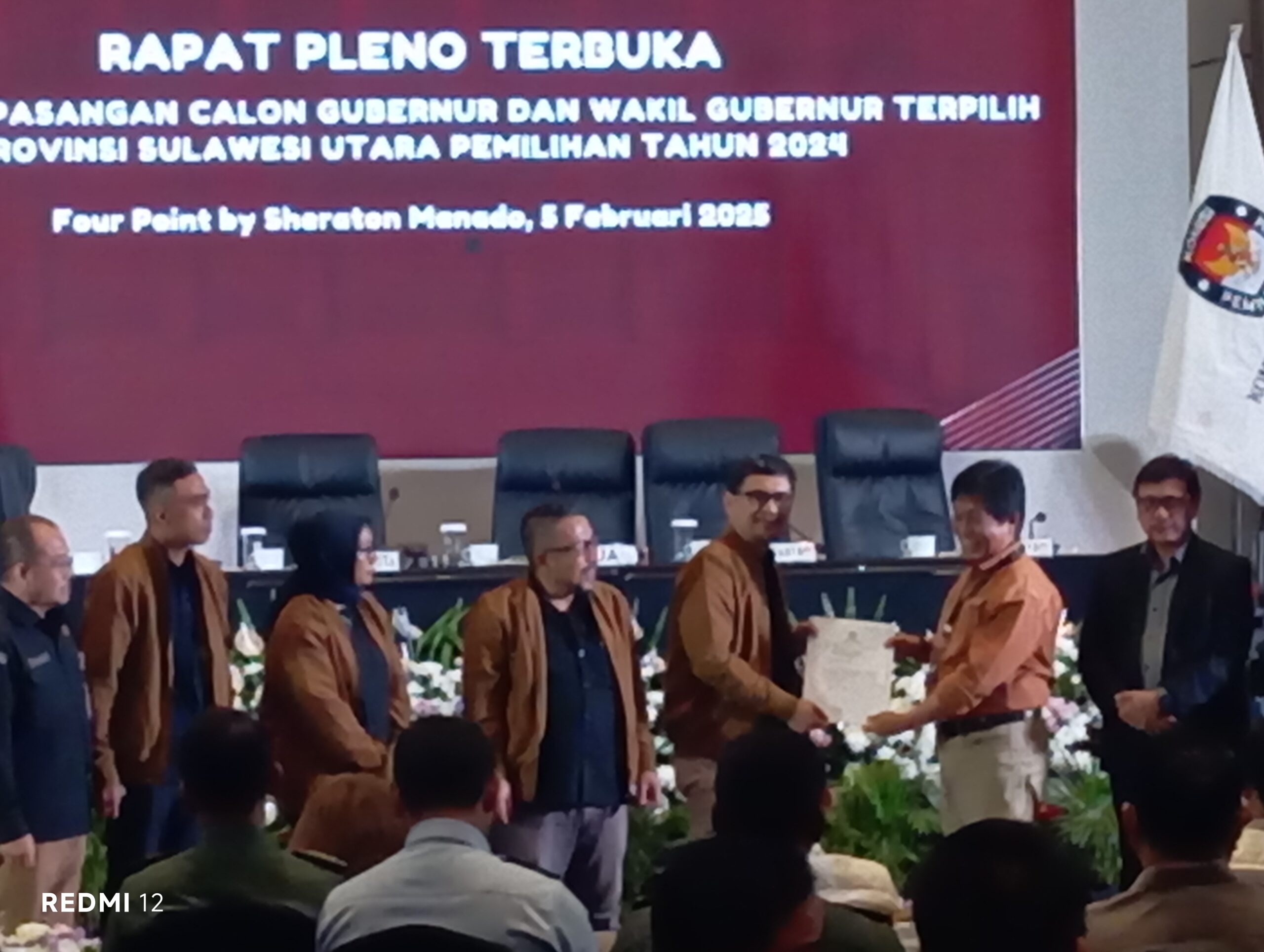 Rapat pleno terbuka dipimpin oleh Ketua KPU Sulut Kenly Poluan dan jajaran Komosioner, membacakan SK menetapkan paslon nomor urut 1 Mayjen (Purn) Yulius Selvanus dan Victor Mailangkay sebagai Gubernur dan Wakil Gubernur Sulut terpilih pada Pilkada 2024.