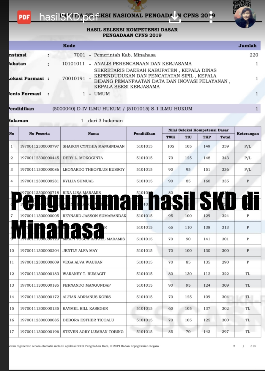 PEMERINTAH Kabupaten Minahasa telah mengumumkan rekapitulasi hasil Seleksi Kompetensi Dasar pengadaan CPNS 2019. Kepala Badan kepegawaian Daerah (BKD,red) Minahasa Moudy Pangerapan melalui akun sosial Facebooknya telah membagikan surat pengumuman tentang hasil seleksi ini.