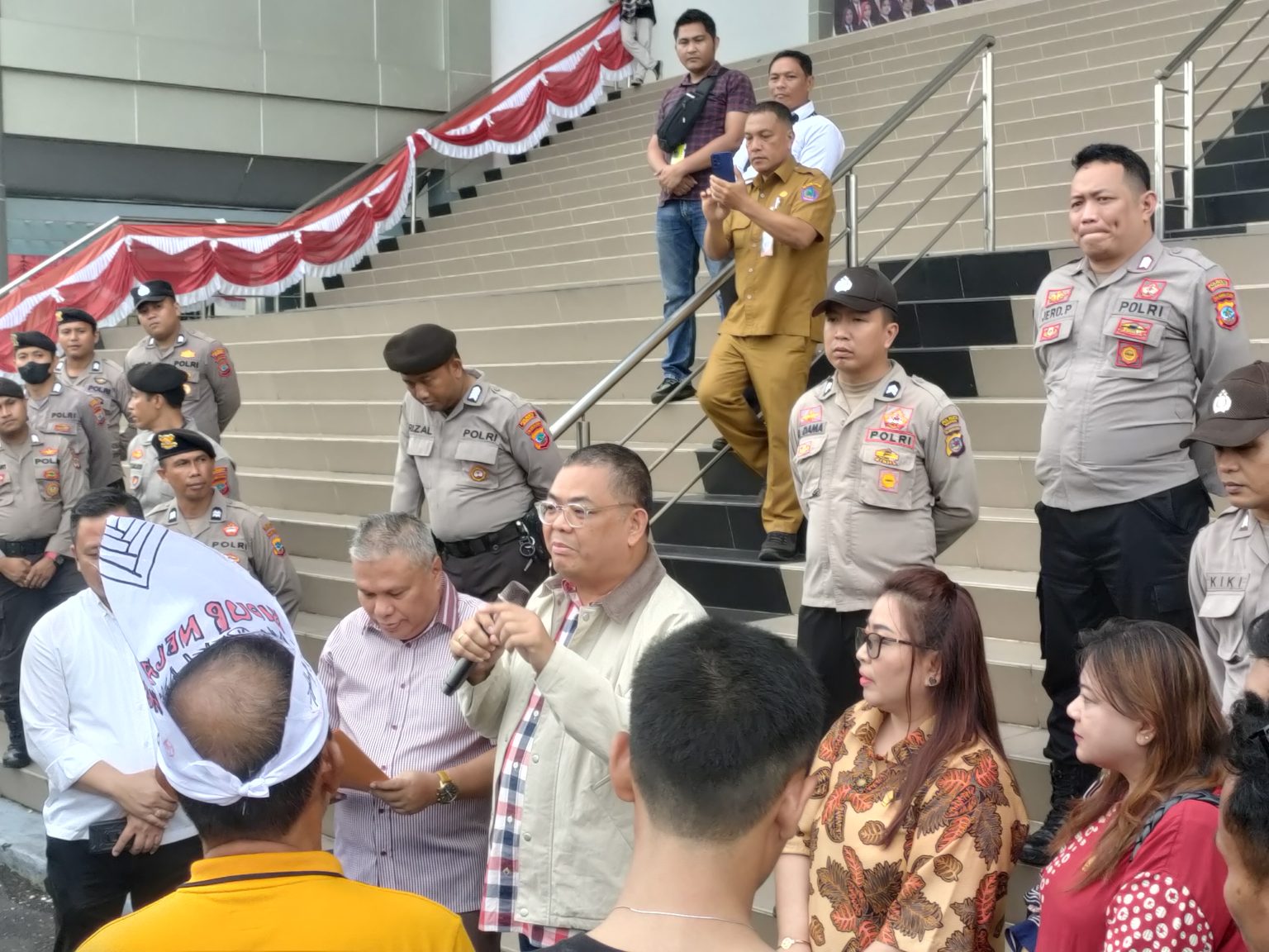 Massa yang mengatasnamakan Masyarakat Tolak Reklamasi Pantai Manado Utara ini diterima oleh Anggota DPRD Sulut Louis Carl Schramm bersama Amir Liputo, Jeane Lulujan, dan Pricylia Rondo, Senin (7/10/2024) di halaman DPRD Sulut.