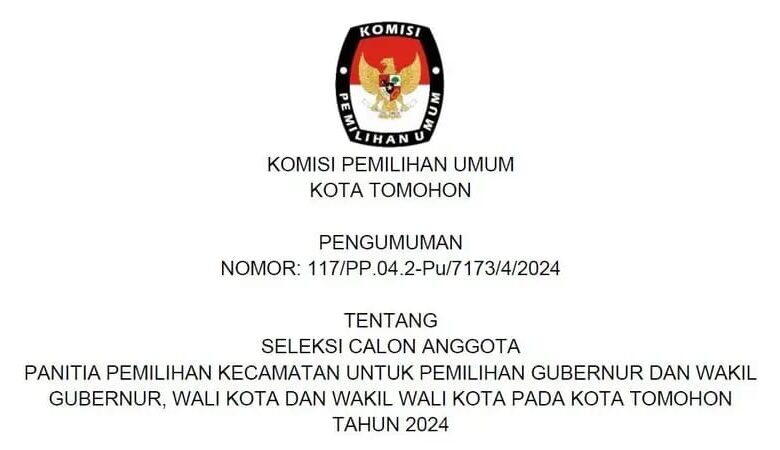 BERITA ONLINE LOKAL, TOMOHON – Komisi Pemilihan Umum (KPU) Kota Tomohon mengeluarkan Pengumuman Seleksi Calon Anggota Panitia Pemilihan Kecamatan (PPK) untuk Pemilihan Gubernur dan Wakil Gubernur serta Walikota dan Wakil Walikota pada Kota Tomohon Tahun 2024.