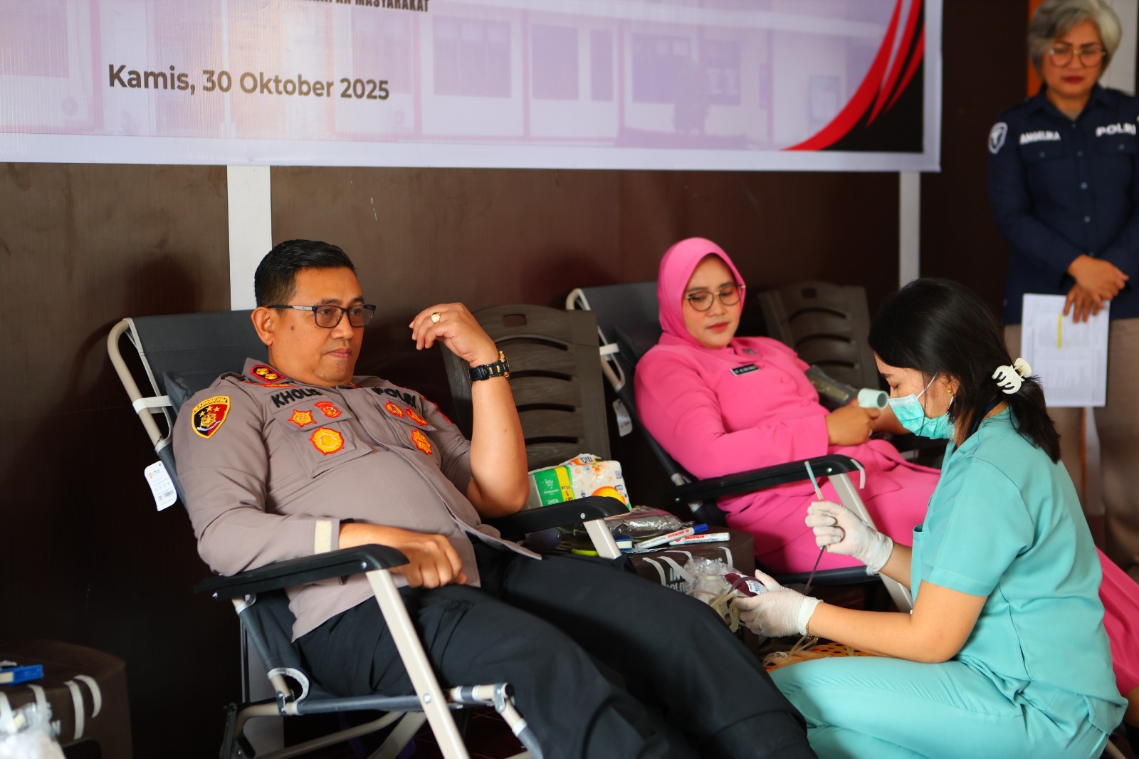 Kapolres Tomohon AKBP Nur Kholis, S.I.K. bersama Ketua Bhayangkari Cabang Tomohon Ny. Ike Nur Kholis, turut menjadi pendonor darah dan menyumbangkan dua kantong darah untuk membantu sesama yang membutuhkan.
