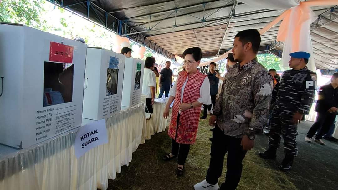 Penjabat Bupati Sangihe dr. Rinny Tamuntuan bersama Komisioner KPU dan Forkopimda Sangihe saat itu juga melakukan peninjauan lokasi TPS VIII sebagai tempat pelaksanaan simulasi pemungutan dan penghitungan suara.