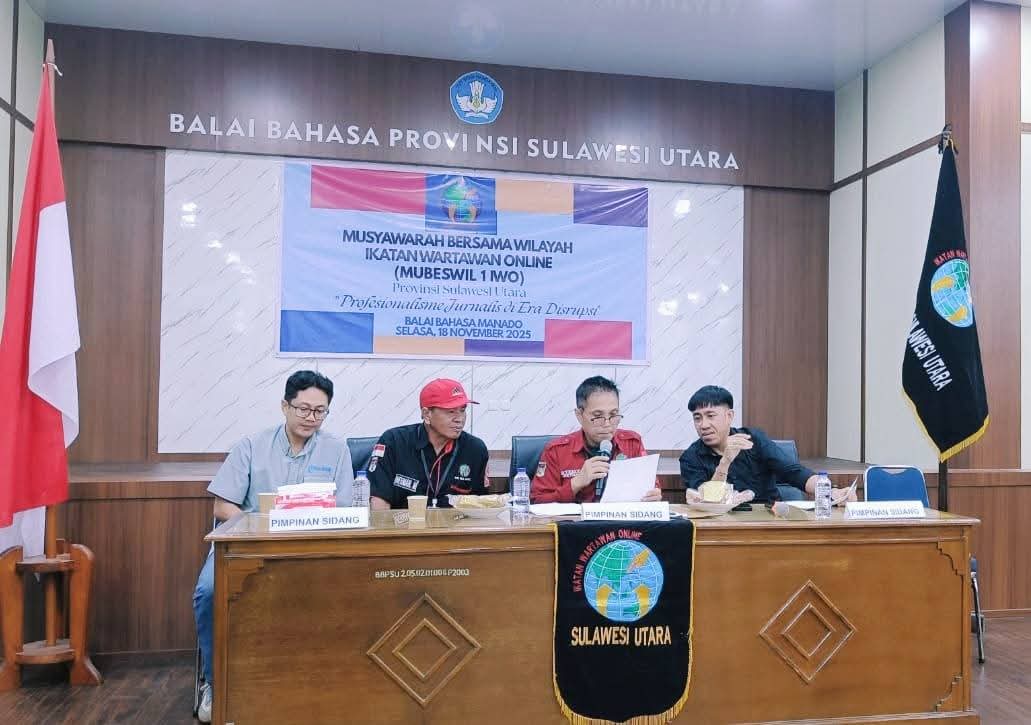 MANADO, BERITA ONLINE LOKAL, – Organisasi Ikatan Wartawan Online (IWO), menggelar Musyawarah bersama wilayah, (Mubeswil), yang bertemakan ” Profesionlisme Jurnalis Era Disrupsi “. yang berlangsung di Aula Kantor Balai Bahasa Provinsi Sulawesi Utara, Jl. Diponegoro Kelurahan Teling, Kota Manado, Selasa (18/11/2025).